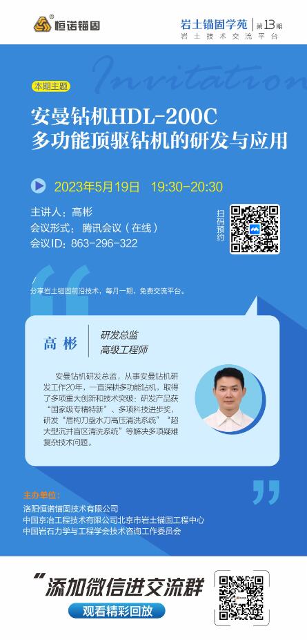 巖土錨固學苑將于2023年5月19日(周五)19:30-20:30舉辦第13期,本期主題:安曼鉆機HDL-200C多功能頂驅鉆機的研發與應用,歡迎廣大巖土錨固領域愛好者參與交流。