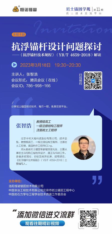 巖土錨固學苑是由洛陽恒諾錨固技術有限公司、中國京冶工程技術有限公司北京市巖土錨固工程中心和中國巖石力學與工程學會技術咨詢工作委員會聯合舉辦的線上交流研討會,兩月一期邀請行業內不同專家學者線上分享巖土錨固的技術、工藝、產品、應用等,旨在為廣大巖土領域人士提供免費的學習平臺,增進巖土錨固專家、學者、從業人員之間的互動交流。