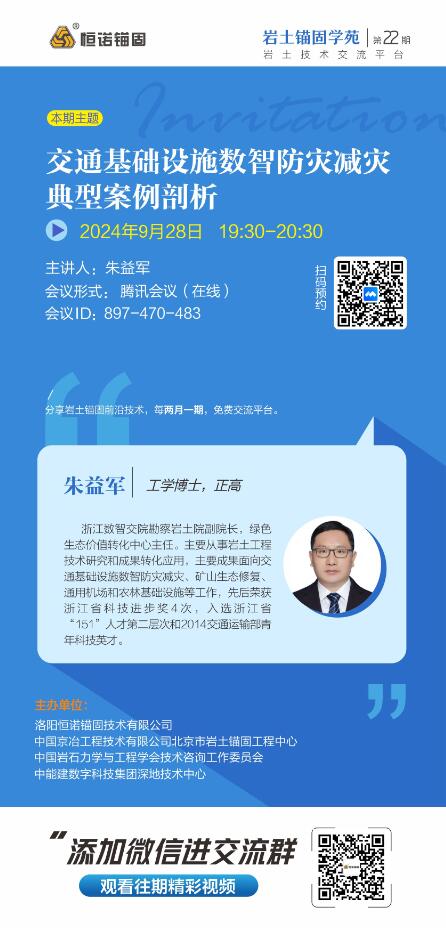 巖土錨固學苑將于2024年9月28日(周六)19:30-20:30舉辦第21期,本期主題:交通基礎設施數智防災減災典型案例剖析,歡迎廣大巖土錨固領域愛好者參與交流。