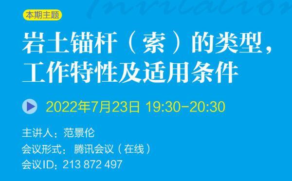 發布日期:2022-08-19 15:19巖土錨固學苑將于2022年7月23日(周六)19:30-20:30舉辦第3期,本期主題:巖土錨桿(索)的類型,工作特性及適用條件,歡迎廣大巖土錨固領域愛好者參與交流。...