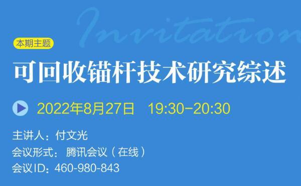 發布日期:2022-09-19 09:55巖土錨固學苑將于2022年8月27日(周六)19:30-20:30舉辦第期,本期主題:可回收錨桿技術研究綜述,歡迎廣大巖土錨固領域愛好者參與交流。 會議形式:騰訊會議(在線......