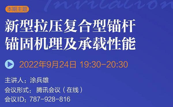 發布日期:2022-09-26 10:51巖土錨固學苑將于2022年9月24日(周六)19:30-20:30舉辦第5期,本期主題:新型拉壓復合型錨桿錨固機理及承載性能,歡迎廣大巖土錨固領域愛好者參與交流。...