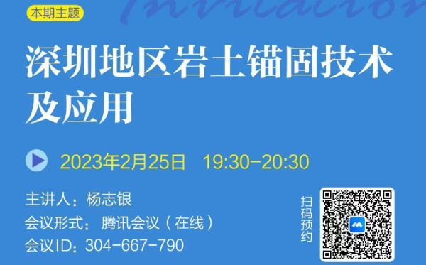 發布日期:2023-02-11 10:45巖土錨固學苑將于2023年1月14日(周六)19:30-20:30舉辦第9期,本期主題:巖土工程柔性支護新技術及應用,歡迎廣大巖土錨固領域愛好者參與交流。...