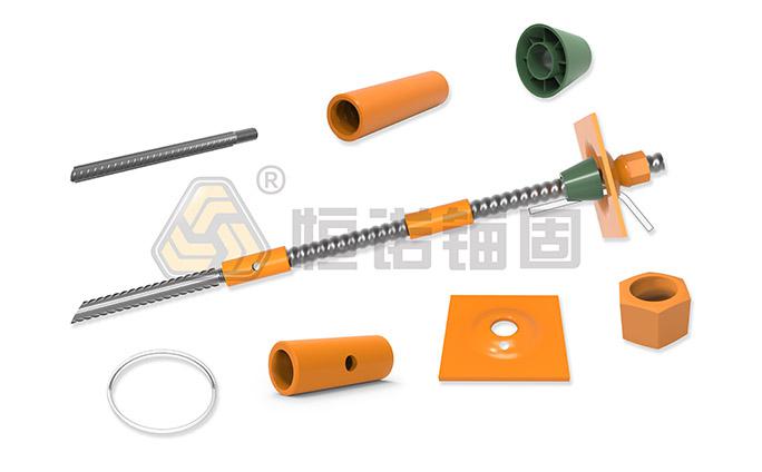 預應力中空錨桿根據錨桿端部固定型式不同,分為機械錨固和黏結錨固。機械錨固指對中空錨桿體施加預張拉力的錨桿,以漲殼錨頭作為錨固端、中空錨桿體作為受力桿件,且螺母和墊板作為受力配件的中空錨固系統。黏結錨固指以錨固劑黏結中空錨桿體及孔壁作為錨固端,中空錨桿體作為受力桿件,螺母和墊板作為受力配件的中空錨固系統。