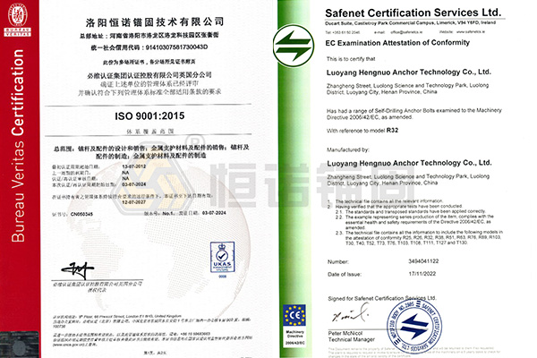 為規范公司業務流程、有效控制風險,形成標準化質量管理模式,恒諾與必維國際檢驗集團進行戰略合作,持續推行ISO 9001質量管理體系認證工作。自鉆式錨固系統產品獲得CE認證證書,取得進入歐盟市場的銷售通行證。
